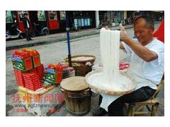 三、方河米粉:系金溪傳統名產,明朝時就見于市場。它選用優質晚米,人工精制而成,具有清白、細嫩、光滑柔韌的特點。久煮更韌,齒咬不斷,飄以雞肉湯,鮮美可口,縣人常把此品作為饋贈親友禮品。方何米粉制作時,須先把米淘三次,濾凈泔水,放入缸內用清水浸,熱天浸4-5天,冷天浸10-15天,然后用磨磨成粉,將粉搓成粗園條,放入熱水中煮,煮至半熟即取出,放至石碓中去碓,然后取出搓成粉筒般粗的粉聚,再用粉榨將粉聚榨入沸水鍋中,煮熟后撈起,放入裝有鮮井水的缸內,冷卻后把粉條鋪在竹摺上,排成長寬相同的粉條,放在太陽底下曬4-6個小時,干后取下,收藏待用。方何米粉既可涼拌吃,又能炒著吃,還能制成湯泡粉。