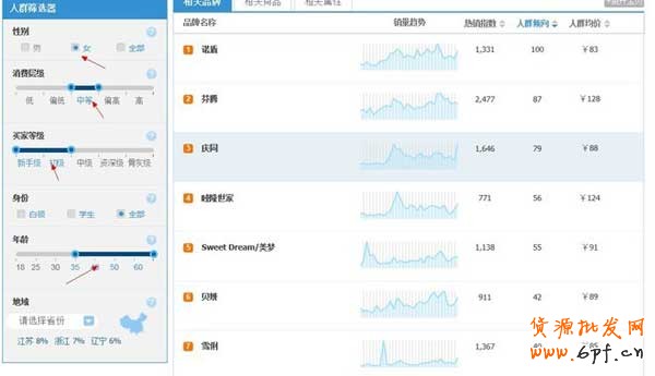 下面,我使用人群篩選器,看一下我的目標人群的情況。不同的人群,在選款和定價策略上面會有差別。這里我根據前面看到的性別丶年齡和買家等級來篩選。這里會發現不同的人群喜好是不同的。