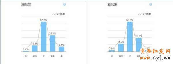 柱形是這個詞的消費基數,線型全網的消費基數。基本上都是中層消費等級居多。
