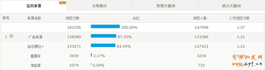 第一個案例,此款寶貝為某類目爆款,周成交量為5000筆,可以看到,鉆展流量占到85%是13萬,而直通車流量僅為3千。第一個原因,此寶貝主關鍵詞點擊費用cpc均價為6元,而鉆展一個流量0.5元很容易;第二個原因,此關鍵詞一天全網僅有數千次搜索,就算全淘寶搜索你永遠是第一,也完全不夠用,所以流量獲取轉移到鉆展上是非常合理的,當其他商家還都糾結在依靠每天可憐的幾百個搜索量打造爆款時,你已經看到流量藍海,一周獲取充足的幾萬UV,來打造你的爆款,這種情況下,無人能和你競爭,因為依靠直通車的商家流量有限,而你的展示型廣告流量是無天花板限制的。