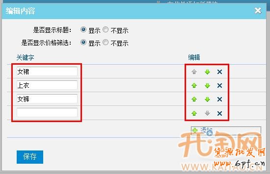 下一步,就開始對搜索寶貝模塊進行編輯。在這一步,掌柜自己可以根據自己的要求選擇是否顯示標題,是否顯示價格篩選等選項。也可以再關鍵詞列表中進行編輯,如下圖所示:
