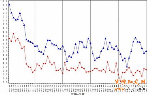 從圖中可以看出,所有的流量都控制在前五頁,第一頁的點擊率好的位置是1-8位,后幾頁的排位基本控制在6-13的位置。知道這個情況后,我們針對排位進行優(yōu)化。