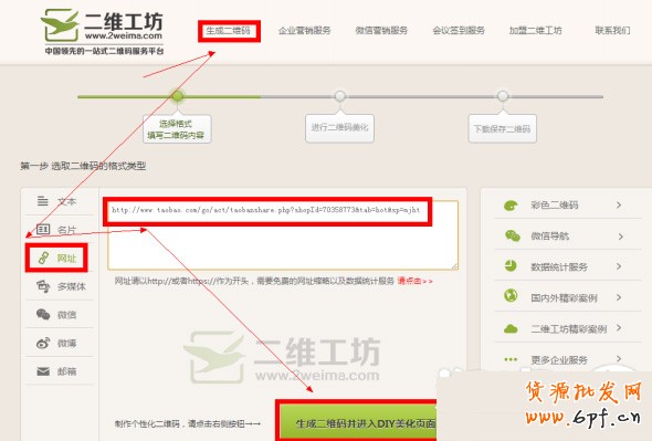 進入二維工坊----點擊“生成二維碼”----選擇網址----粘貼上面修改好的店鋪專屬鏈接地址---生成二維碼并進入DIY美化。