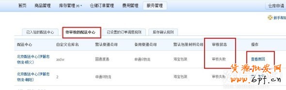二、在待審核的配送中心可以查看到申請的配送中心審核的狀態(tài), 以及查看審核失敗的原因