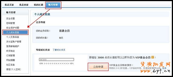 進入“我的淘寶”—“賬號管理”—“個人成長信息”頁面,如您的成長值已經(jīng)達到申請條件,您可以點擊“立刻申請”進行提交(點此查看如何提高成長值)。