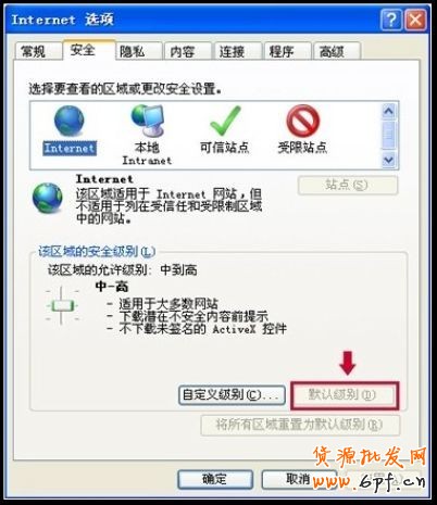 第一步:點擊瀏覽器菜單欄上的“工具”—“Internet選項”—“安全”,選擇internet區(qū)域,查看下圖紅框中的“默認級別”按鈕,如果不是灰的,請點擊按鈕,反之,則不做任何操作。