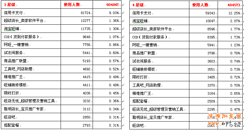 從各星級賣家訂購占比的數據中,我們可以看出各星級的訂購賣家服務工具的賣家在該星級的總賣家數中的占比情況。規律是,星級越高,訂購服務工具的賣家占比越大?;使谝陨系挠嗁彿展ぞ叩馁u家占比基本都在80%以上。由此可以看出,越高星級的賣家對服務工具的需求越大;隨著店鋪規模的加增,賣家依靠人力來對店鋪進行管理,營銷越來越不可能,這個時候必須要借助一些賣家服務工具。
