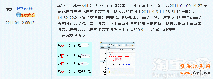 “只要您是正規加款的且確定已經轉款,即使客戶退款給差評,您提交確鑿證據啦,淘小二也會移評處理的。” 多踏實的答復,我這就是正規的轉款呀。于是,我作出了拒絕退款的答復,并將我已經成功轉款的記錄和我與買家的旺旺對話記錄(轉款成功后我給他發了請盡快確認收貨的留言,過了幾分鐘,他回答了 的手勢)進行了截圖作為證據。