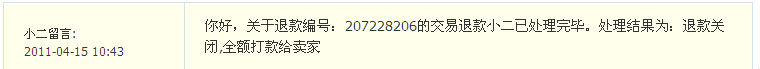 隨后的幾天里,我就想法與買家聯系,萬一是人家查錯了,不能錯怪人家呀。可是一直就再沒見他的旺旺亮過,也聯系不上他。不管怎么說也得等呀,看他會作出什么樣的答復。結果等待買家回應的時候早已經過了,還是沒有任何回應??晌也荒芫瓦@樣拖著呀,這可是我自己的血汗錢呀。于是我申請了淘寶客服介入處理。就算這時,我的心還是不踏實,這到底算不算刷信譽,如果真的算刷信譽,把我的店鋪反過來處理了,該怎么辦呀?可是橫下心一想,管他呢,反正都已經提交了,就等待淘寶處理吧。您還別說,這淘寶小二處理之快, 我是8:10分提交的申請淘寶客服介入處理,10:43就有了答復:“你好,關于退款編號:207228206的交易退款小二已處理完畢。處理結果為:退款關閉,全額打款給賣家。” 這不就是把錢又打給我了嗎?我那個心里呀終于踏實了下來。 現在想想,如果我不拿起維權的武器,那我不是就白白地丟了9.9元錢嗎?如果我不拿起維權的武器,我不是也不知道這是屬于正常的交易嗎?如果我不拿起維權的武器,那還會有多少遇到類似問題的親們不知道該如何處理嗎?