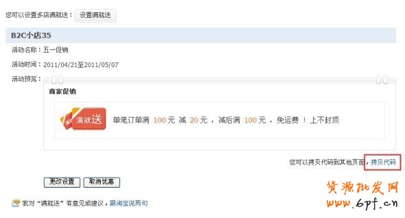 設(shè)置完成后點擊“完成設(shè)置”,即出現(xiàn)如下頁面,在預(yù)覽頁面的右下角有“拷貝代碼”入口,我們可以將代碼放到店鋪中的醒目位置,讓更多進店的買家知道我們店鋪在做什么樣的促銷活動。