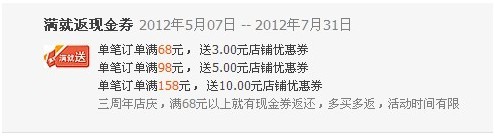 基于旺鋪,給賣家提供一個店鋪營銷平臺,通過這個營銷平臺可以給賣家更多的流量。讓賣家的店鋪促銷活動可以面向全網(wǎng)推廣,將便宜、優(yōu)惠的店鋪促銷活動推廣到買家。滿就送包括滿就減,滿就送禮,滿就送積分,滿就免郵費等,如下滿就返現(xiàn)金券,也是比較實用的一款。
