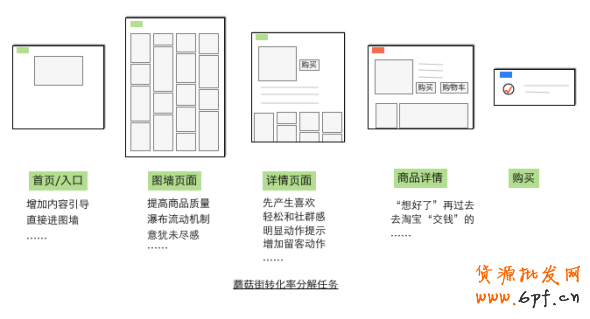 “在蘑菇街逛”的部分,用戶從各種渠道進入首頁或者推廣頁,進入瀑布流的圖墻,這是第一步轉(zhuǎn)化,基本是100%都會進瀑布流。