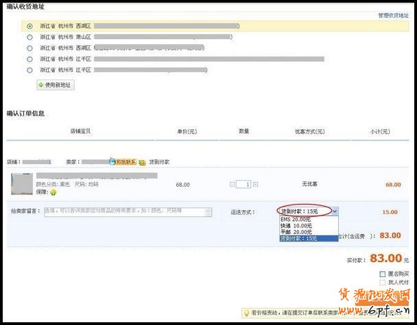 確認(rèn)收貨地址、購買數(shù)量等信息,選擇運(yùn)送方式為“貨到付款”即,系統(tǒng)會(huì)提示您選擇貨到付款運(yùn)送的價(jià)格(快遞費(fèi)加服務(wù)費(fèi)的總和)。