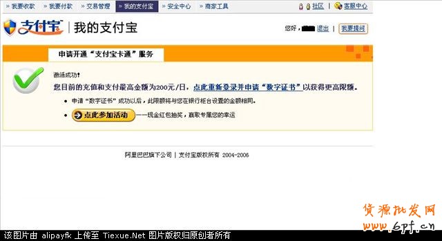 回到家中,登陸我的支付寶(www.alipay.com),激活支付寶龍卡和支付寶帳戶的綁定。
