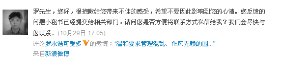 時刻5:2012年10月30日,@國航小秘書 在羅永浩投訴微博下再次評論留言: