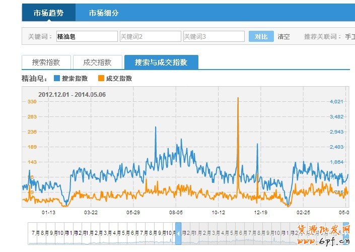 第二,數(shù)據(jù)說(shuō)話!精油皂在淘寶市場(chǎng)上,體量不是很大但未來(lái)趨勢(shì)不錯(cuò)。截兩張圖看下,第一張圖顯示2012.12.01~2014.05.06期間精油皂的搜索指數(shù)大大高于成交指數(shù),第二張圖顯示2014年2月12日(周三)的成交指數(shù),精油皂是44,洗面奶是595,從精油皂和洗面奶成交指數(shù)對(duì)比,就可以看出未來(lái)的市場(chǎng)潛力了。