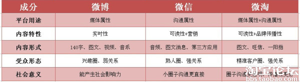 社會化營銷很廣,做過的人都知道,從最初的旺旺群、QQ群、短信、EDM、BBS、APP、后面又殺出蘑菇街、美麗說等,其他的這里不做概論,相信做過的人心里都有本賬;這里我就說現在的三微:微博、微信、微淘,你怎么看?我剛做微淘,因為不懂,所以特意對比了下這幾個產品;請看下圖: