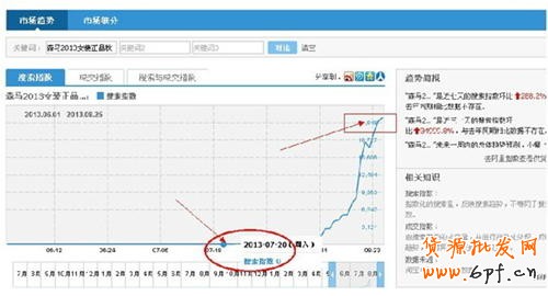 再來看指數(shù) ,我們可以看到在7月20日之前搜索指數(shù)是0 ,所以可以肯定的說 ,這個(gè)詞是淘寶“幫忙”推起來的。另外,指數(shù)數(shù)據(jù)要比數(shù)據(jù)魔方的數(shù)據(jù)早一天顯示,做運(yùn)營的都知道,早一天24小時(shí)是什么概念。