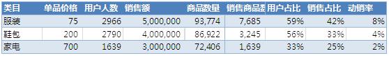 類目的整體分析主要看類目的主要銷售商品的價格是多少,覆蓋人群是多少,總體的商品數量是多少,分別的占比是多少。