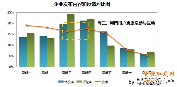 周一到周三用戶不夠活躍:建議企業在周四進行更多的營銷活動,將前半周的發博量轉移一部分到后半周