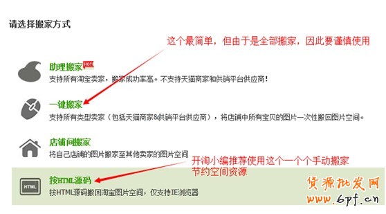 在選擇搬家方式上,若你家的寶貝描述里用了很多站外圖片,小編建議你使用“按html源碼”搬家的方式,如果你的圖片比較少,只是使用淘寶店鋪裝修模板,這個方式也很值得推薦。