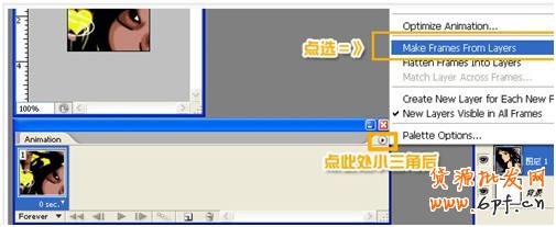 第四步,點擊小三角后選擇Make frames From Layers,中文一般顯示“從圖層建立帖”,就是把每層分布于帖。