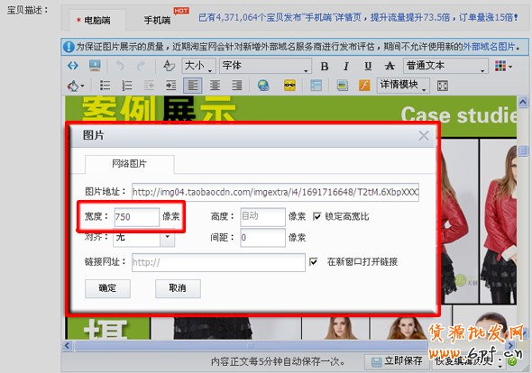 一切準備就緒,就可以編輯寶貝上架啦,這時候,要注意一下哦,如果是集市店,寶貝詳情頁的圖片尺寸最大為寬750,如果是天貓就是寬790,大家不會調尺寸的話,可以在上傳了圖片后,雙擊圖片,就會彈出圖片調節框,把寬設定為750/790就行,很方便的哦。不過原始圖片可不能比這個小,要不然被拉大會很模糊,產品就不清晰了。