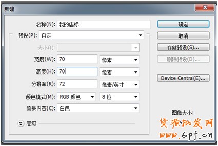 第一步,打開PS,點(diǎn)擊“文件”然后新建一個(gè)文件,命名為“我的店標(biāo)”,并把高和寬都設(shè)置為70px,具體操作如下: