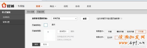 然后我們就可以在裝修頁面上安裝了點擊裝修頁面里的→樣式管理 點擊→背景設置 上傳剛才存儲下的頁頭背景可以了背景顯示:設置成居中不平鋪 完了以后保存就好了