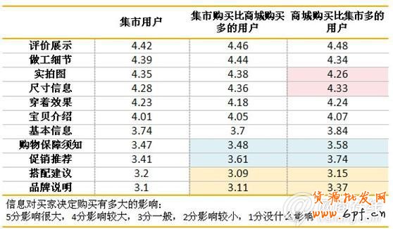 而通過對以上11類信息的買家評分,我們發(fā)現(xiàn)評價(jià)展示和做工細(xì)節(jié)是買家認(rèn)為對購買決策影響最大的類別。一個區(qū)別就是商城型的買家更在意評價(jià)、而集市型的買家更在意做工細(xì)節(jié)。