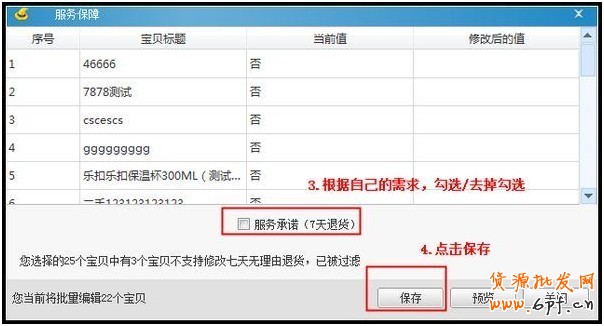 3. 勾選/不勾選“服務承諾(7天退貨)”(ps:當前值“否”指:這些寶貝目前的狀態是不支持7天退貨服務,如果您要讓寶貝有這個服務,勾選下方“服務承諾(7天退貨) ”,反之,如果顯示“是”,即當前寶貝狀態支持7天退貨,如果您需要去掉這個服務,下方的“服務承諾(7天退貨) ”保持不勾選的狀態)