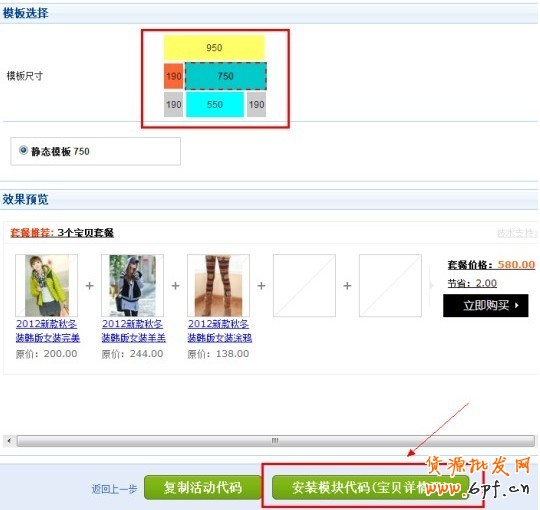 6、選擇合適模板尺寸,預(yù)覽效果,點擊【安裝模塊代碼(寶貝詳情頁)】
