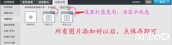 當我們圖片都添加好以后,所添加的每個標題模塊上有藍色小勾的,就表示圖片在空間里顯示了!最后點保存,就算完成了!