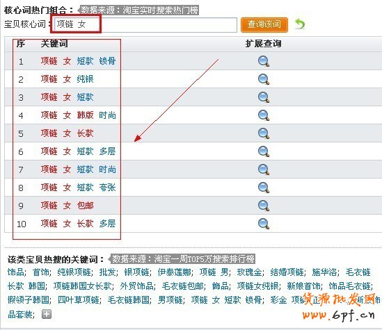 舉例:點擊第一組關(guān)鍵熱詞“項鏈 女”后擴展查詢到下面的此表,可以得到細化一些的關(guān)鍵詞。