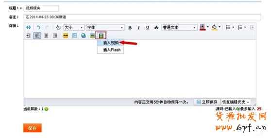 第二步,進(jìn)入新建模塊的構(gòu)建頁面,把相關(guān)的信息填寫完整。主要填寫好模塊的標(biāo)題,然后插入視頻即可。當(dāng)然,你也可以適當(dāng)?shù)木庉嬏砑有┠芡怀鲆曨l的文字,但要注意精簡。