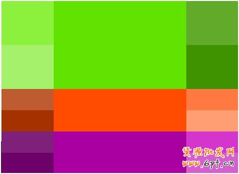 這是紅色和綠色的色調(diào)經(jīng)過不同純度、明度調(diào)試后所得配色方案。這個對比度很強(qiáng),運(yùn)用時不宜同時大范圍使用。