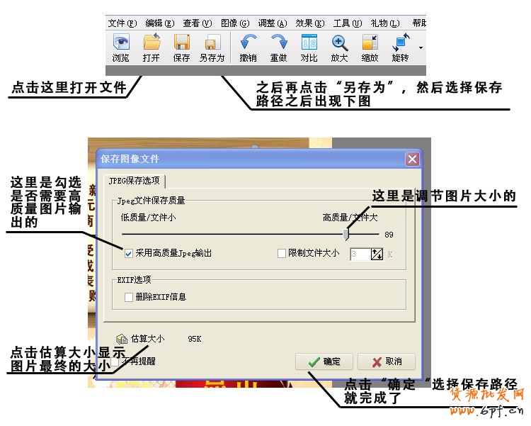 這里有個小竅門,因為在photoshop里也可以保存JPG格式的圖片,我為什么不用呢?這是我通過多次的實踐之后發現,使用photoshop保存出來的圖片顯示效果沒有用光影魔術手保存出來的清晰和效果好。哈哈,這就是實踐的力量!