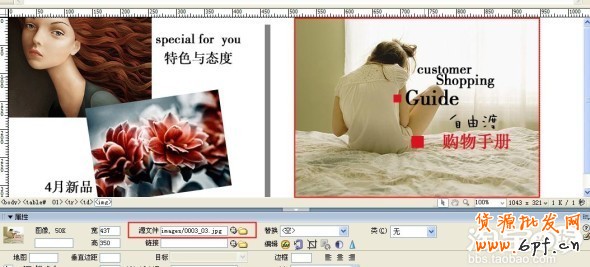 根據以上步驟,再用同樣的方法獲得02和03的圖片地址,分別點擊選中DW中的源文件地址,修改過來。在這個步驟需要說明的是:02是空白的剩余圖,是我不需要點擊鏈接的地方。所以只是更換了空間地址,而不需要有圖片鏈接地址。由于最開始的時候圖片地址是本地電腦的地址,為了在店鋪中顯示,依然要在圖片空間中獲得0003_02圖片的地址,更換源文件。 這一點大家明白了吧。