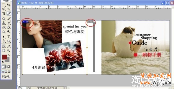 在下圖這個地方大家就可以很清晰的看見我在上圖所切片的位置,0003_01 就是第一張四月新要鏈接的圖,藍色編碼為01;0003_02是ps自動為剩下的圖編碼,灰色02;0003_03是第三張“自由渡手冊”想鏈接的地方,所以切的是第三張圖。