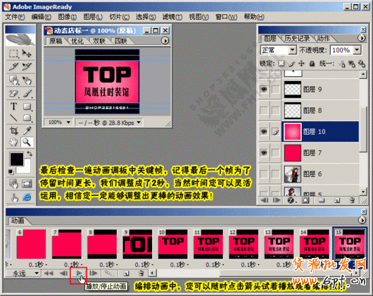 12.ImageReady是PS 捆綁軟件,界面大同小異,使用簡單,點“窗口”菜單調出“動畫”調板。配合圖層的顯示和隱藏,我們就能設計出漂亮的動畫。