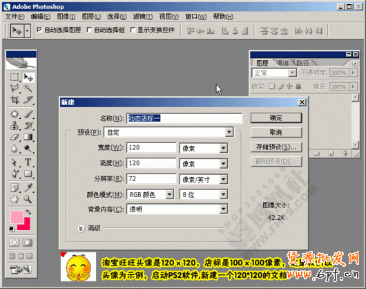 好了!看完動態店標實例,我們接下來開始設計制作動態網店店標了。掌柜們都知道淘寶旺旺頭像是120*120,店標是100*100像素的,這里我們以頭像為示例,啟動PS2軟件先建一個120*120的文檔。