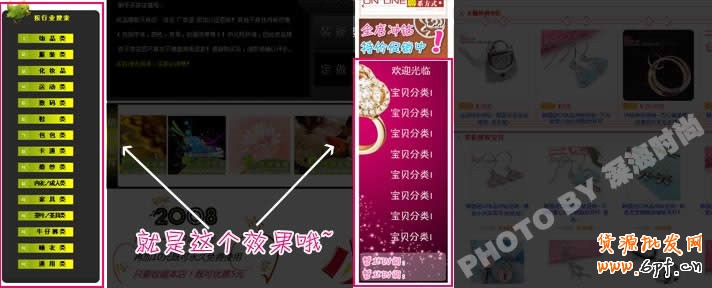 淘寶旺鋪寶貝分類完美整體設計。不知道大家看到過沒有,有些漂亮的店鋪,首頁左側分類區是很完整的圖形哦,中間沒有任何分割空白。用管理后臺的填加分類然后換成圖片這種傳統方法是完全做不到的,那么他們是怎么做的呢?先看看我所說的效果: