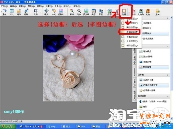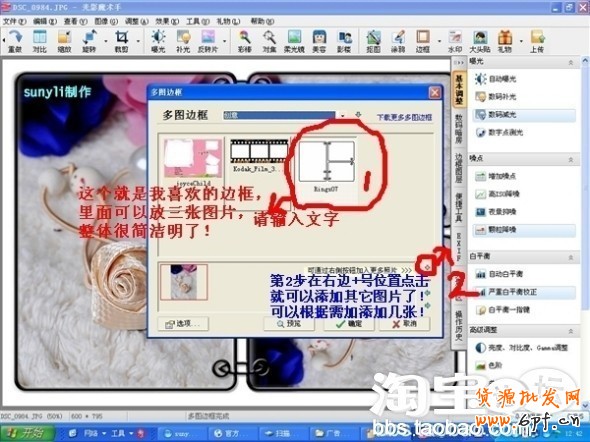 在編輯界面里面打開上欄右上角的邊框---選多圖邊框---然后在中間選創意,(我個人比較喜歡這個里面的一款多圖邊框,它比較簡潔,可以放三張圖片,而且這個邊框沒有多余的花式跟文字,適合很多的產品)比較推薦哦!
