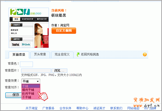 五、背景對齊:使用“1平鋪”時,上下左右均無限延伸,就不存在對齊了,就是一個平面無限延伸!使用“橫向平鋪”時,左右無限延伸,淘寶默認為上下無限延伸,所以也不支持選擇對齊!使用其它平鋪,因為沒有充滿整個平面,它就可以選擇 ← ↑ → 方向,根據(jù)自己需要去設(shè)定,不知道什么效果的,自己去一種種的試,全部試一下就知道了。