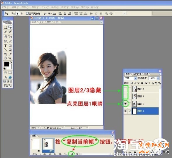 新建第二幀且把圖層1點亮眼睛,把圖層2/3隱藏