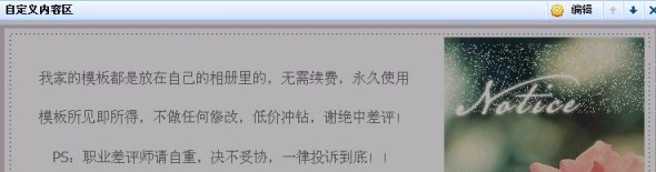 PS:扶植版只能添加1個右側自定義區,如果您已有1個自定義區,請直接編輯原有的促銷區,將代碼粘貼到原來代碼的下方(慎用,因為1個自定義區的代碼大小不能超過20K,所以不一定每個模板都適用)想將2個代碼一起用的親可以先看下那2個代碼的記事本分別為多大,超過12K一般就不行了,因為你自己編輯的文字圖片也大概要占個7-8K。