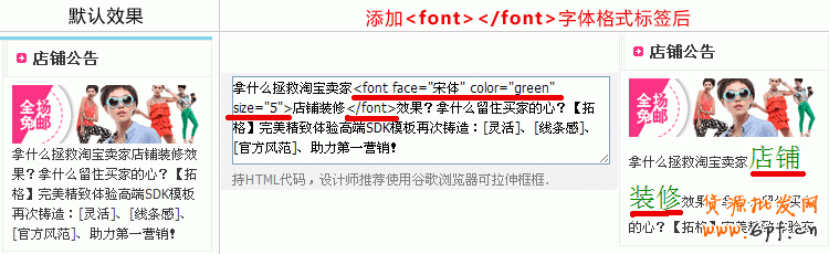 這里介紹幾個常用的HTML標簽使用方法,以編輯店鋪公告為例: