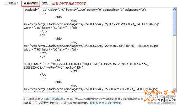 7、轉到寶貝描述“編輯HTML源碼”編輯對話框下,將上一步所拷貝的內容粘貼到對話框的編輯區中。然后點擊“使用編輯器”按鈕。