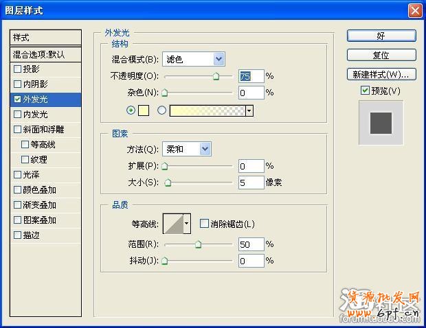 為了讓字更顯目,這時可以在圖層混合樣式中選擇效果。在字體圖層上點右鍵,在彈出菜單中選擇“混合選項”,在彈出對話框中選擇合適的效果,比如“外發光”。