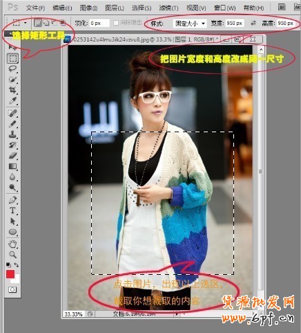 2.選擇工具欄中的矩形工具,在屬性欄樣式中選擇固大小,把圖片尺寸高度和寬度的值改成一樣(如:950*950)然后點擊圖片,出現(xiàn)如圖選區(qū),移動選區(qū)裁取你想要的內(nèi)容。如下圖所示: